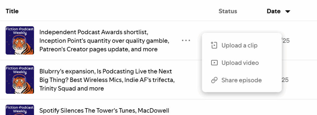 Inside Spotify for Creators, go to the Episodes tab and click the three dots next to any episode. You’ll see options to upload a clip (a short vertical video) or a full video version of the episode.